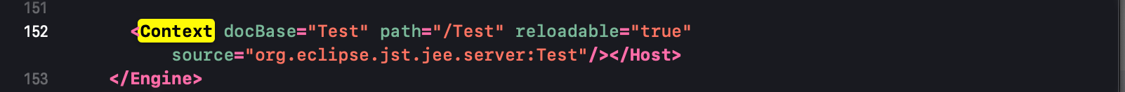 - server.xml에서 <Context> 태그에 path를 확인한다. Project의 이름인 'Test'로 설정되어 있다.